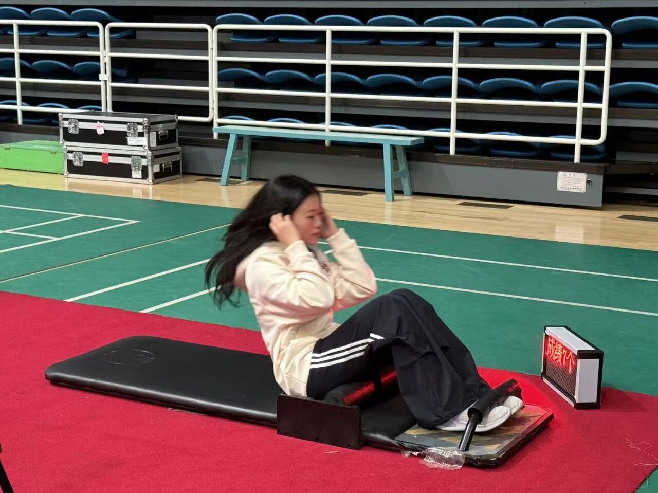 热身过后,在清华大学综合体育馆、体育活动中心、东区田径场,学生们分别进行了身高、体重、肺活量的测量,参加了坐位体前屈、立定跳远、引体向上、仰卧起坐、50米跑、800 米跑、1000米跑等全部项目。