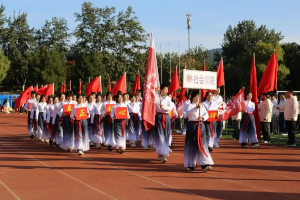 “心系竞技,梦归赛场;携手同行,共谱华章。”铿锵有力的口号声在耳畔响起,由社院42名同学组成的方阵正昂首阔步向主席台走来,他们步伐沉稳,眼神坚定。阳光下的他们英姿飒爽,展现着社院学子的青春风貌。